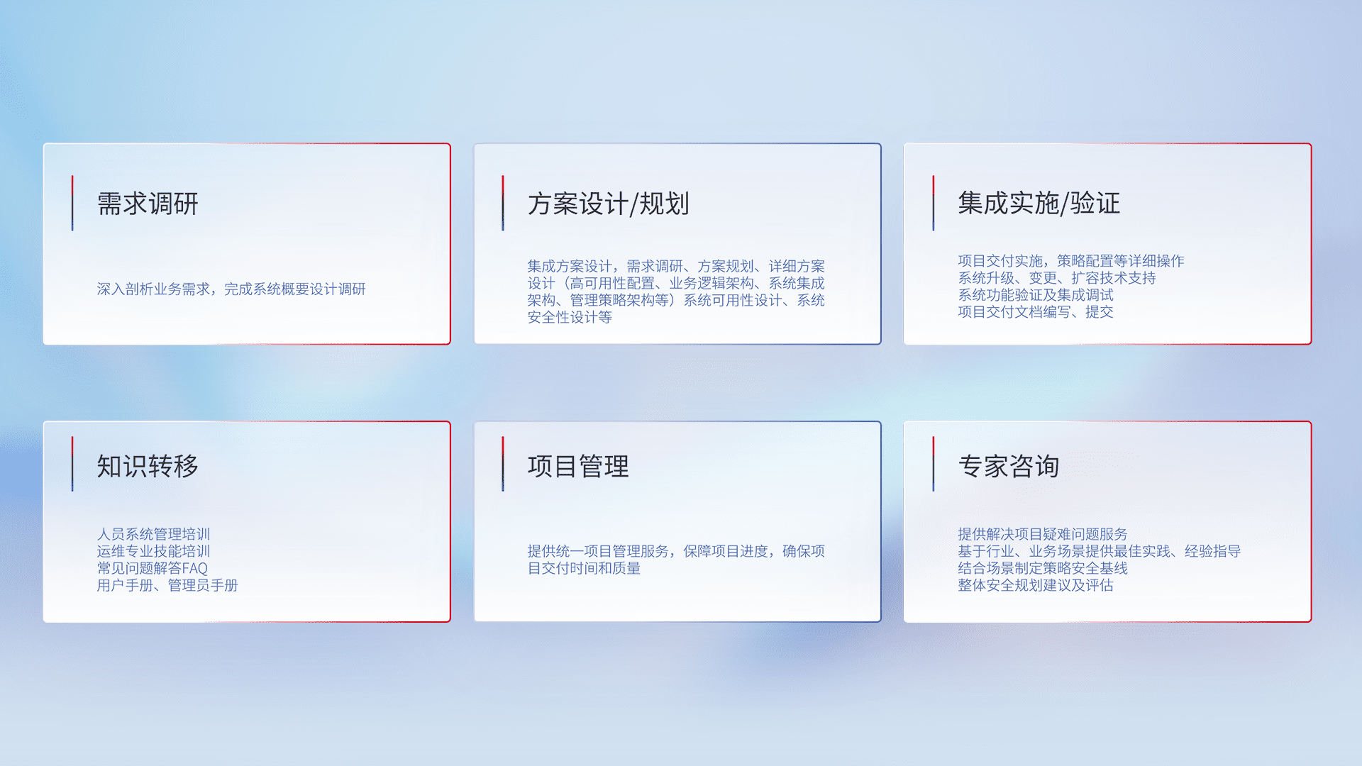 针对客户行业特性,,,将宏观的安全战略和需求,,通过专业的交付服务,,实现项目落地,,,,为客户提供标准规范的集成交付服务。。。。